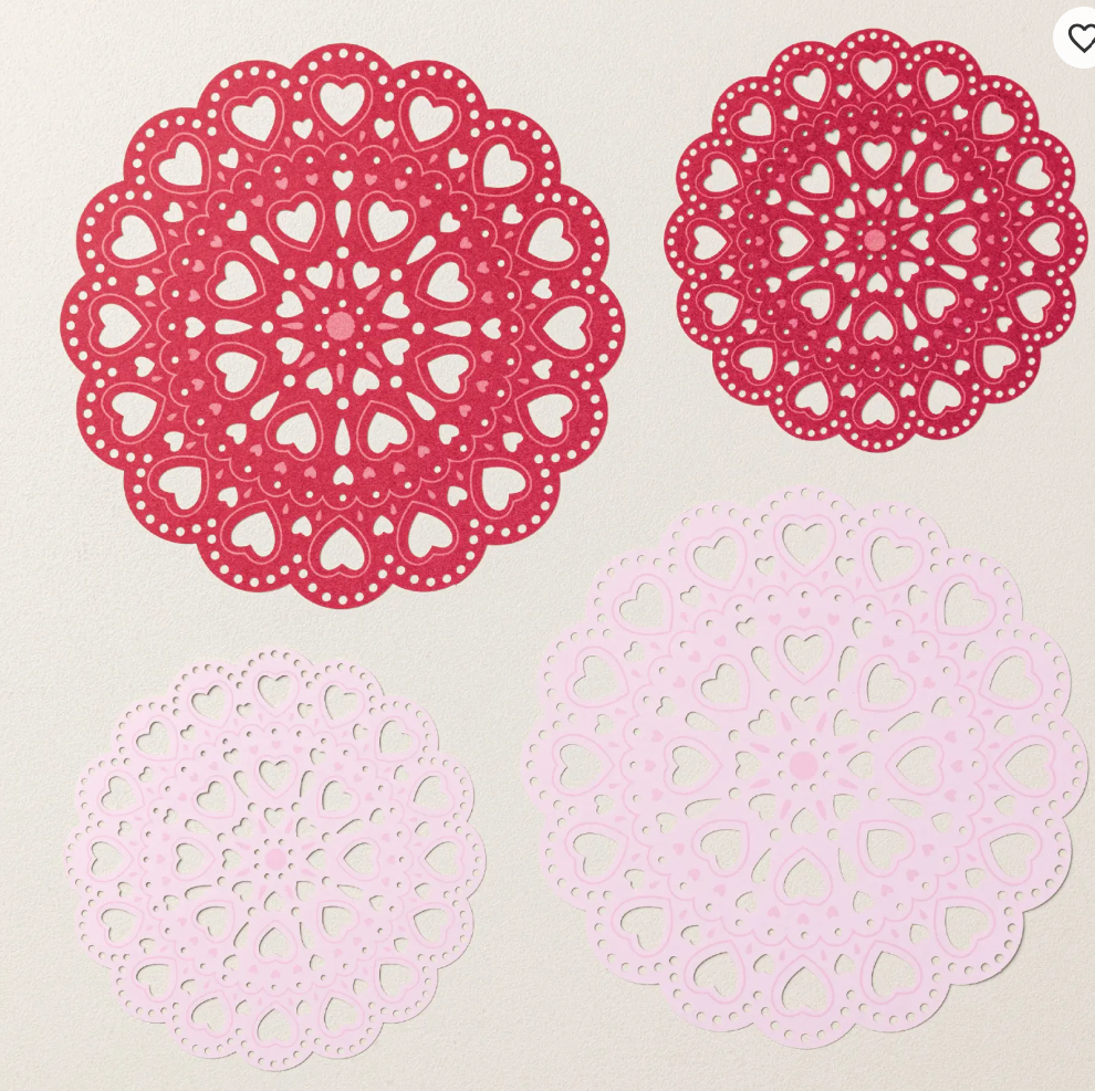 I added our new Sparkle Dot Essentials to the card. You can find these on page 64 of our Mini catty. #166991 $8-.The Lovely Doilies can be found in our On-Line Exclusives. They are only $8- for a pack of 24. The back side of the red are white. So you can choose from 3 colors. It’s item #167104.
